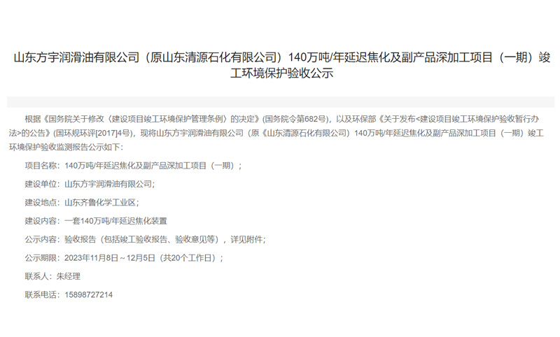 山東方宇潤(rùn)滑油有限公司(原山東清源石化有限公司)140萬(wàn)噸/年延遲焦化及副產(chǎn)品深加工項(xiàng)目(一期)竣工環(huán)境保護(hù)驗(yàn)收公示