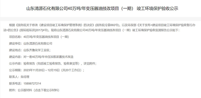 山東清源石化有限公司40萬(wàn)噸/年變壓器油技改項(xiàng)目(一期) 竣工環(huán)境保護(hù)驗(yàn)收公示