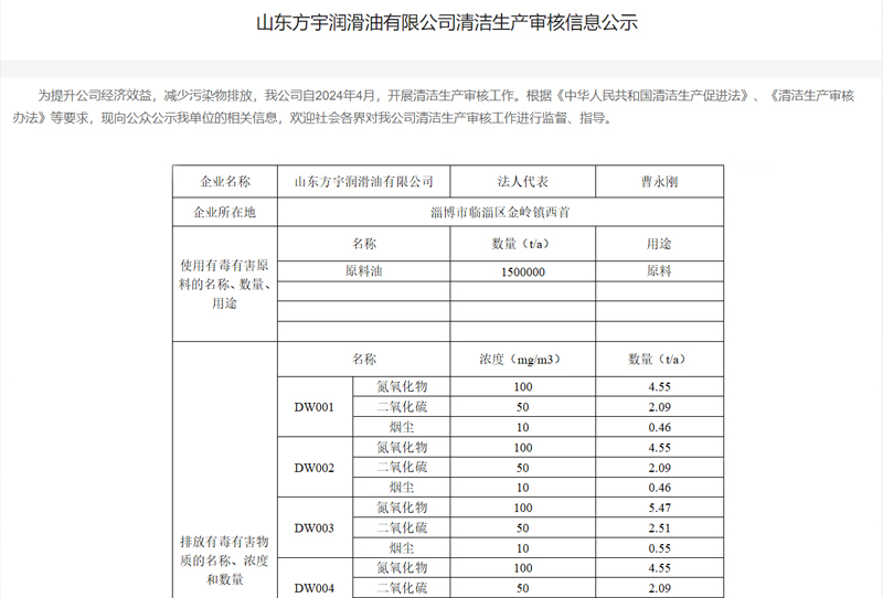 山東方宇潤(rùn)滑油有限公司清潔生產(chǎn)審核信息公示